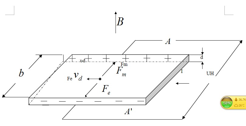 所謂霍爾效應:相當于把一塊寬為b,厚為d的導電板放在磁感應強度為B的磁場(chǎng)中,并在導電板中通以縱向電流I ,此時(shí)在板的橫向兩側面A、A′,之間就呈現出一定的電勢差,這一現象稱(chēng)為霍爾效應,所產(chǎn)生的電勢差UH稱(chēng)霍爾電壓。高斯計就是利用這一原理來(lái)測量磁場(chǎng)強度的。如圖所示: